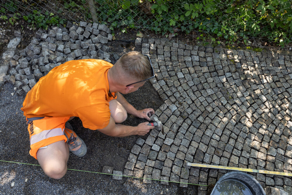 Zusätzlich setzten wir Stellplatten und einen Dreifachbund als Wasserlauf auf einer Länge von 60 m. Etwa alle 10 m bauten wir einen Schacht, der unter der Treppe hindurchführt. Unter den Ausläufen der Schächte erstellten wir mit Geröll Sickerpackungen. Zum Schluss pflasterten wir die Podeste und die Wege zwischen den Treppenstufen neu. Die gereinigten Pflastersteine setzten wir in eine Splittplanie und fugten sie mit Mörtel aus.
