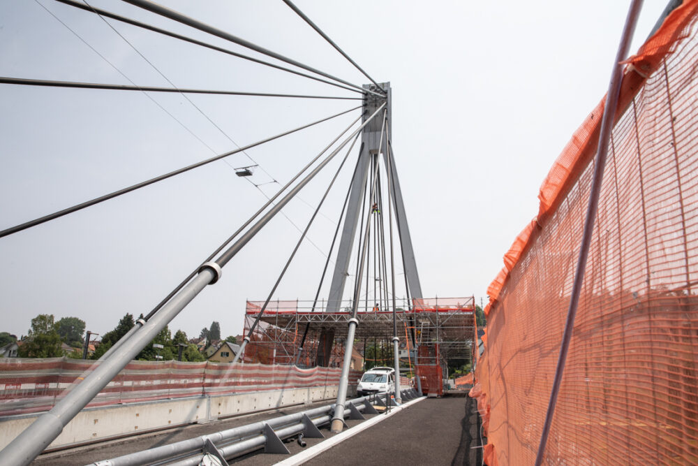 Die Storchenbrücke verbindet das Vogel-sangquartier mit dem Tössfeld und über-spannt die SBB-Zuglinien Zürich–St. Gal-len sowie Winterthur–Bülach. Mit einer Spannweite von 130 m und einem 38 m hohen Pylon zählt sie zu den markantesten Brückenbauten der Stadt. Die Kombination aus ständiger Verkehrsbelastung und che-mischer Einwirkung von Tausalzen machte eine Sanierung erforderlich. Gemeinsam mit verschiedenen Subunternehmern starteten wir im Oktober 2024 mit den Bauarbeiten.