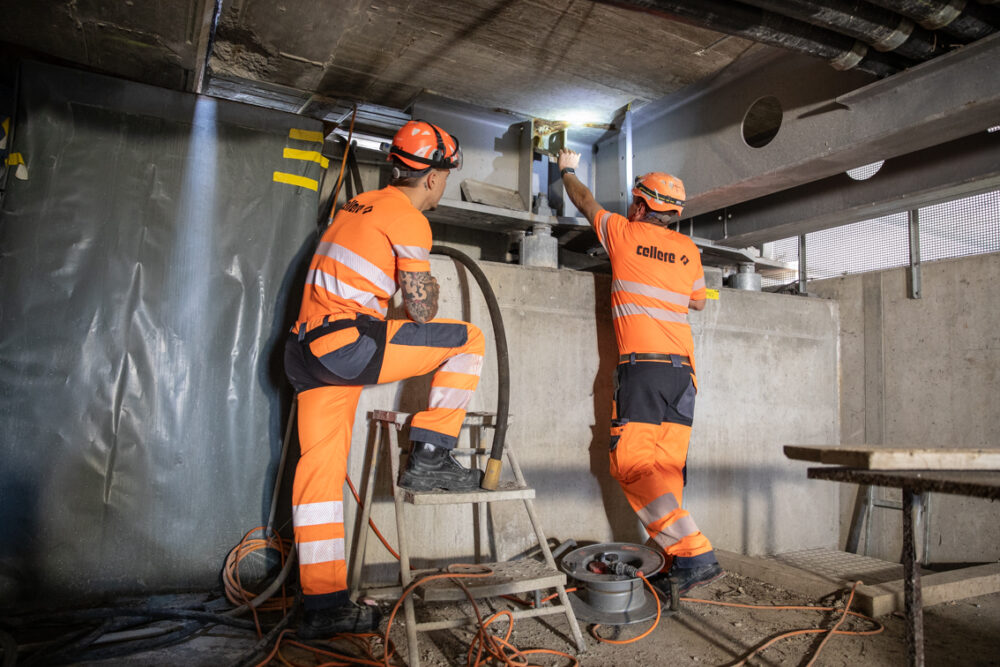 Eine technisch anspruchsvolle Aufgabe war die Instandsetzung der 8 m langen Nieder-haltestangen an den Widerlagern. Diese ins-gesamt 16 Stangen stehen je unter 40 bis 60 t Zugkraft, da sie den Auftrieb der Schrägseile kompensieren und somit die Fahrbahn im Gleichgewicht halten. Gemeinsam mit dem Subunternehmer für Vorspanntechnik so-wie dem Projektierungsteam entwickelten wir ein spezifisches Vorgehen, um die be-stehenden Stangen sicher auszubauen, die Gleitlager in den Widerlagern zu ersetzen und neue Spannkabel einzubauen – ohne da-bei die Stabilität der Brücke zu gefährden.